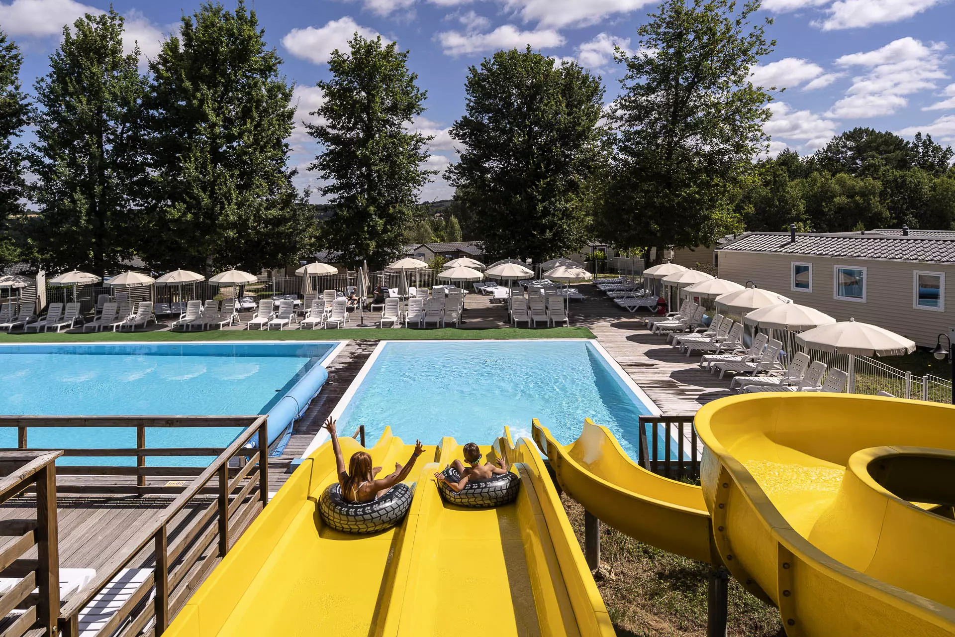 Plonsen, glijden en ontspannen – dat doe je in het uitgebreide waterpark, een van de grootste in de Dordogne! Ontdek de zwembaden en waterglijbanen, en werk aan je vakantiekleurtje op het zalige zonneterras. Vanaf je ligbed zie je door je zonnebril je kinderen in de lazy river dobberen, op zo'n grote opblaasband. Ondertussen vermaken de kleintjes zich in het ondiepe lagunezwembad. Het waterpark is dé plek waar iedereen zijn favoriete zwembadmoment vindt!