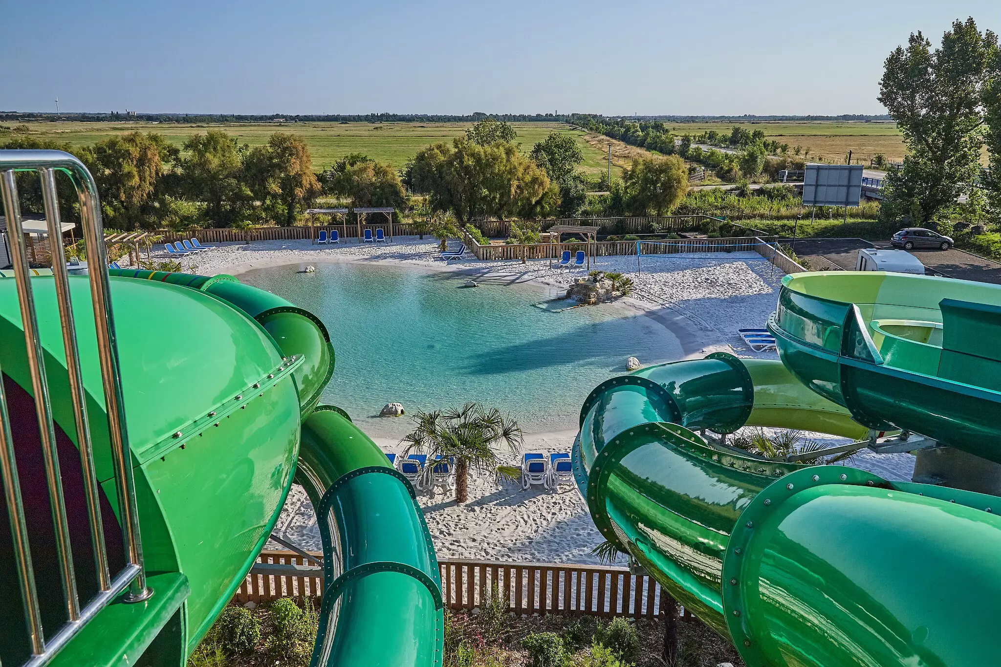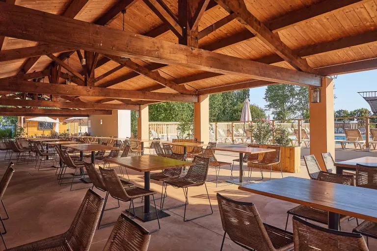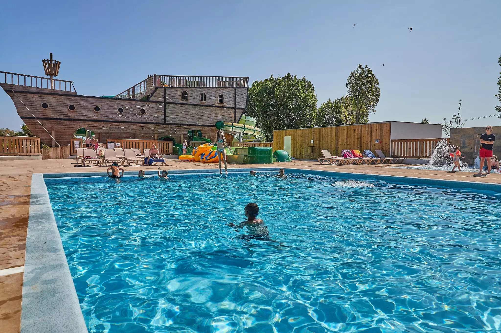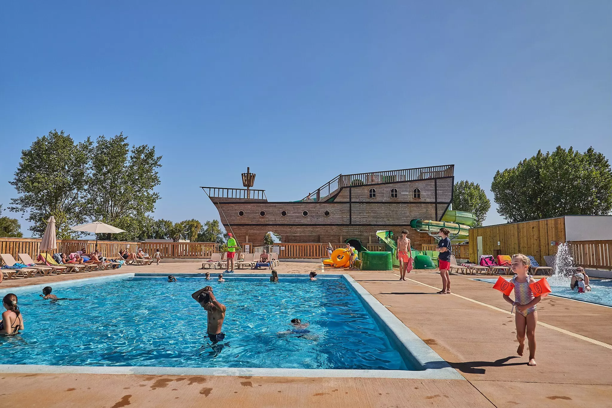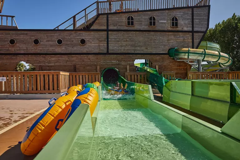 - Eigen strand op de camping – Direct naast het lagunezwembad, met uitzicht op de spectaculaire glijbanen en omringd door groen. Laat de kids los in het buitenbad, binnenbad, kinderbad of op het piratenschip!