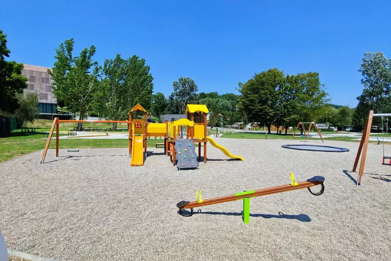 speeltuin met trampoline, schommels, glijbanen en andere speeltoestellen. Het