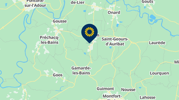 Snelweg A10 PARIJS-BORDEAUX, vervolgens A63 richting BAYONNE, afrit CASTETS en vervolgens DAX. Neem vanaf DAX de N124 richting MONT-DE-MARSAN, afrit Pontonx-sur-Adour, vervolgens richting Mugron / Cassen en vervolgens de borden.