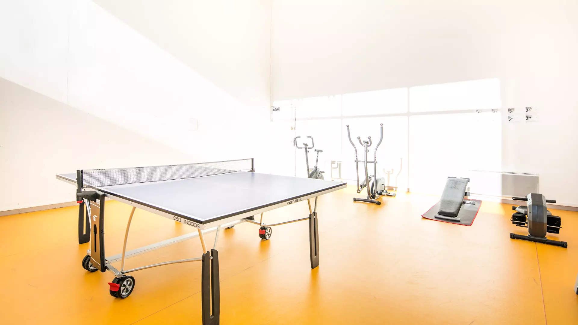 - Fitnessruimte : met 2 loopbanden, 1 roeier en 1 platte fiets; met gratis toegang
